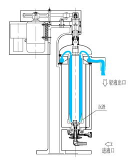 主軸帶動(dòng)轉(zhuǎn)鼓繞自身軸線高速旋轉(zhuǎn),在轉(zhuǎn)鼓內(nèi)形成強(qiáng)大的離心力場(chǎng)。物料由底部進(jìn)料口進(jìn)入轉(zhuǎn)鼓內(nèi),在離心力作用下,迫使物料沿轉(zhuǎn)鼓內(nèi)壁向上流動(dòng)。質(zhì)量輕的液體經(jīng)轉(zhuǎn)鼓上部排液口排出,通過(guò)集液盤(pán)回收;質(zhì)量重的固體沉積在轉(zhuǎn)鼓內(nèi)壁上,形成沉渣層,停機(jī)后人工清除。