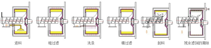 電機帶動皮帶輪驅(qū)動轉(zhuǎn)鼓繞自身軸線高速回轉(zhuǎn),物料在預先編制的程序控制下,通過進料系統(tǒng)進入高速旋轉(zhuǎn)的轉(zhuǎn)鼓內(nèi)。在離心力的作用下,物料均布在過濾介質(zhì)上進行脫液分離,液相透過固相物料和濾網(wǎng)縫隙,經(jīng)鼓壁孔甩至機殼空間,從出液口排出機外,固相物料截留在轉(zhuǎn)鼓內(nèi)形成濾餅。料層檢測裝置實時檢測物料的充填位置,當濾餅達到事先設(shè)定的位置時,自動關(guān)閉加料閥,停止進料,然后對濾餅進行洗滌、脫水,待達到要求后,離心機降到卸料速度,卸料閥打開,刮料器在液動控制下旋轉(zhuǎn)上升,將濾餅刮下掉進螺旋出料器,經(jīng)出料閥排出機外。